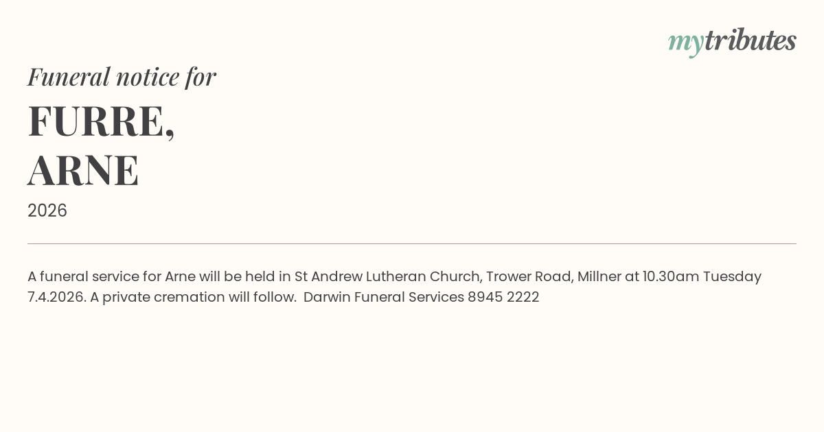 16°CA funeral service for Arne will be held in St Andrew Lutheran Church, Trower Road, Millner at 10.30am Tuesday 7.4.2026. A private cremation will follow. Darwin Funeral Services 8945...
