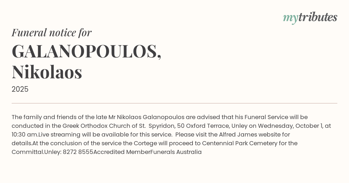 16°CThe family and friends of the late Mr Nikolaos Galanopoulos are advised that his Funeral Service will be conducted in the Greek Orthodox Church of St. Spyridon, 50 Oxford Terrace, Unley on Wednesday, October 1, at 10:30 am.