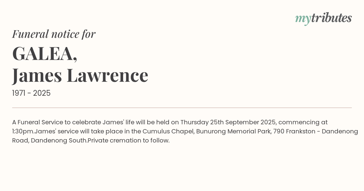 James' service will take place in the Cumulus Chapel, Bunurong Memorial Park, 790 Frankston - Dandenong Road, Dandenong South.