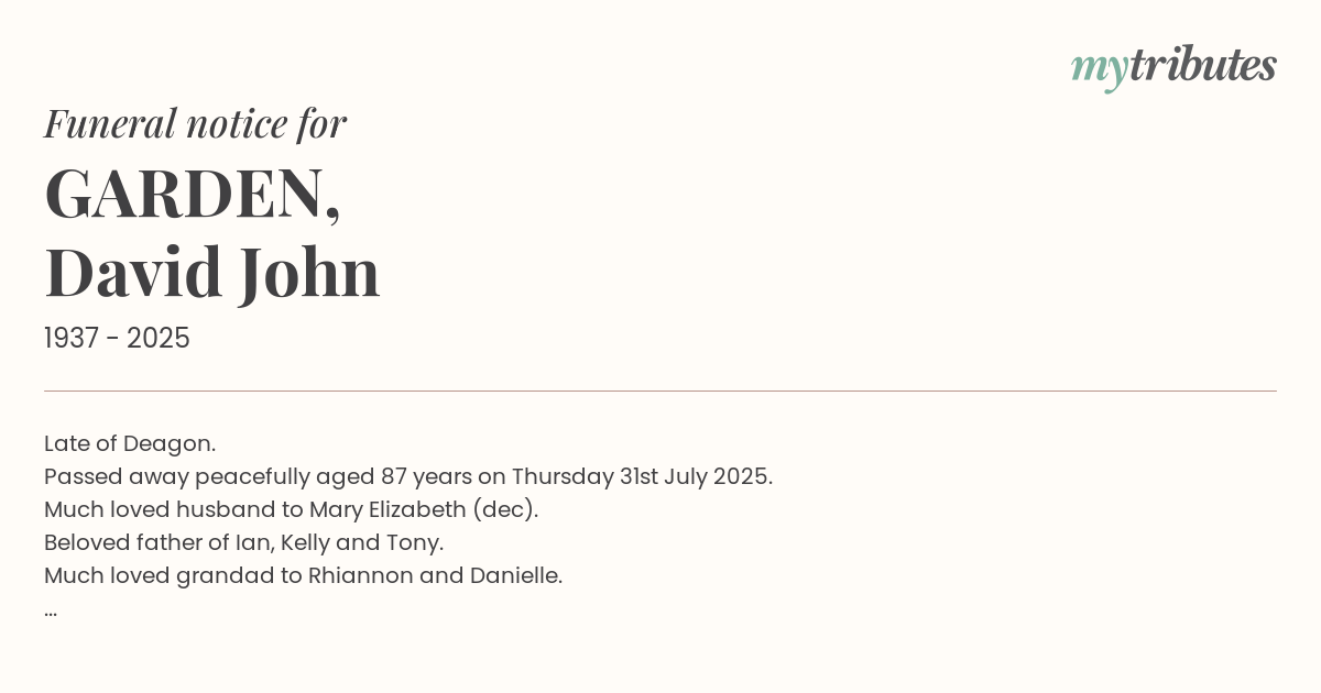 Family and friends are invited to attend a celebration of Davids life to be held on Monday 11 August at The Garden Chapel, Albany Creek Memorial Park