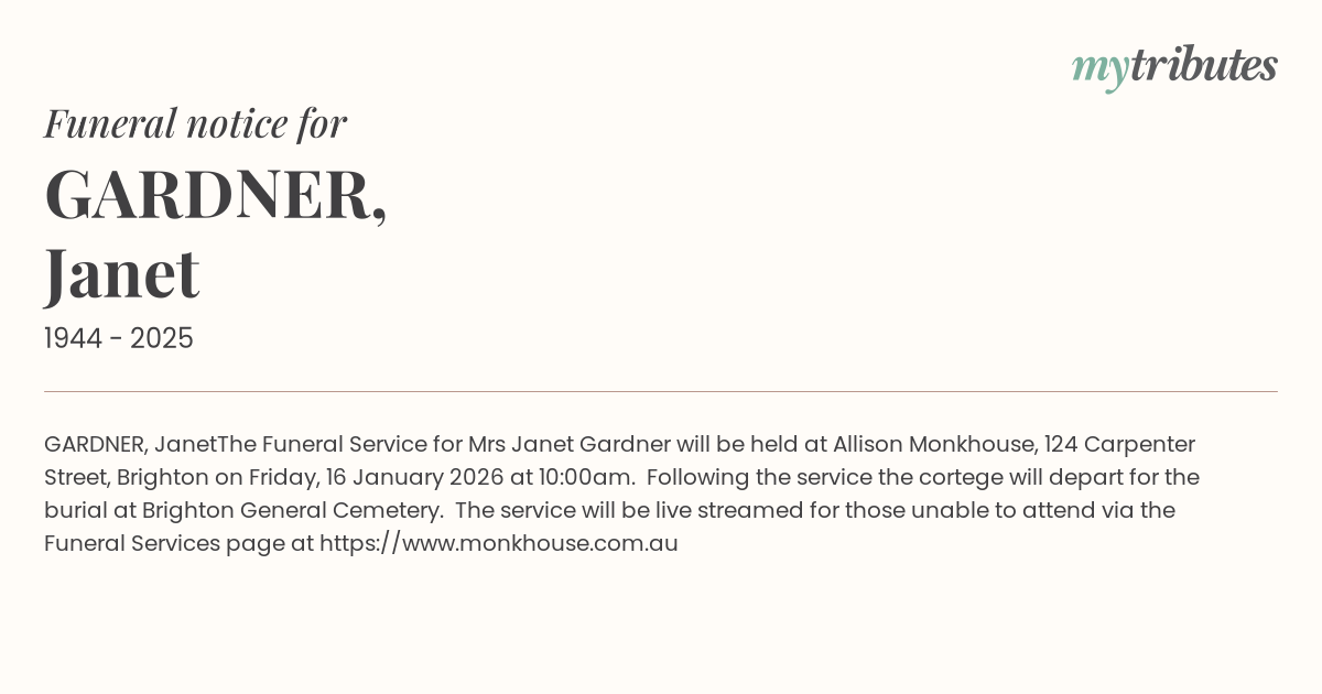 The Funeral Service for Mrs Janet Gardner will be held at Allison Monkhouse, 124 Carpenter Street, Brighton on Friday, 16 January 2026 at 10:00am. Following the service the cortege will depart for the burial at Brighton General Cemetery.