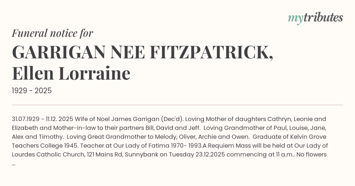 16°C31.07.1929 - 11.12. 2025 Wife of Noel James Garrigan (Dec'd). Loving Mother of daughters Cathryn, Leonie and Elizabeth and Mother-in-law to their partners Bill, David and Jeff. Loving Grandmother of Paul, Louise, Jane, Alex and Timothy. Loving Great Grandmother to Melody, Oliver, Archie and Owen. Graduate of Kelvin Grove Teachers College 1945. Teacher at Our Lady of Fatima 1970- 1993.