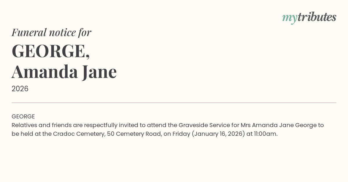 Relatives and friends are respectfully invited to attend the Graveside Service for Mrs Amanda Jane George to be held at the Cradoc Cemetery, 50 Cemetery Road, on Friday (January 16, 2026) at 11:00am.
