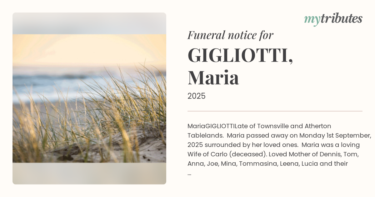 Late of Townsville and Atherton Tablelands. Maria passed away on Monday 1st September, 2025 surrounded by her loved ones. Maria was a loving Wife of Carlo (deceased). Loved Mother of Dennis, Tom, Anna, Joe, Mina, Tommasina, Leena, Lucia and their Families.