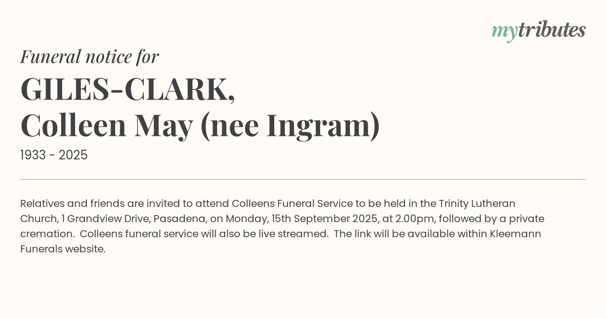 16°CRelatives and friends are invited to attend Colleen’s Funeral Service to be held in the Trinity Lutheran Church, 1 Grandview Drive, Pasadena, on Monday, 15th September 2025, at 2.00pm, followed by a private cremation. Colleen’s funeral service will also be live streamed. The link will be available within Kleemann Funerals website.