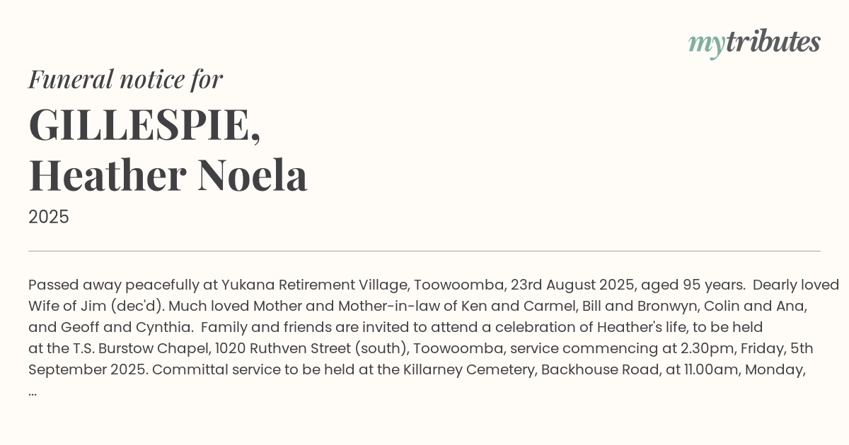 Family and friends are invited to attend a celebration of Heather's life, to be held at the T.S. Burstow Chapel, 1020 Ruthven Street (south), Toowoomba, service commencing at 2.30pm, Friday, 5th September 2025. Committal service to be held at the Killarney Cemetery, Backhouse Road, at 11.00am, Monday, 8th September.