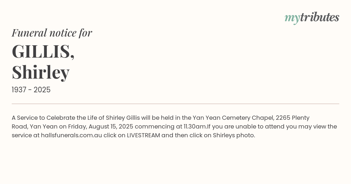 16°CA Service to Celebrate the Life of Shirley Gillis will be held in the Yan Yean Cemetery Chapel, 2265 Plenty Road, Yan Yean on Friday, August 15, 2025 commencing at 11.30am.