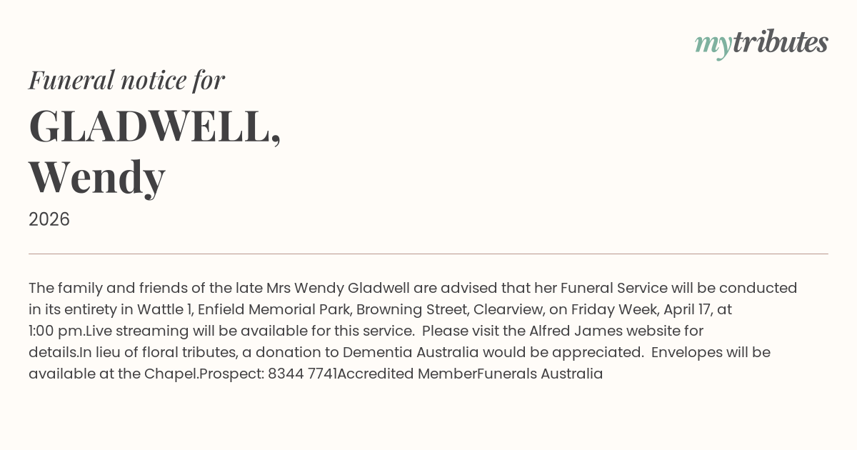 16°CThe family and friends of the late Mrs Wendy Gladwell are advised that her Funeral Service will be conducted in its entirety in Wattle 1, Enfield Memorial Park, Browning Street, Clearview, on Friday Week, April 17, at 1:00 pm.