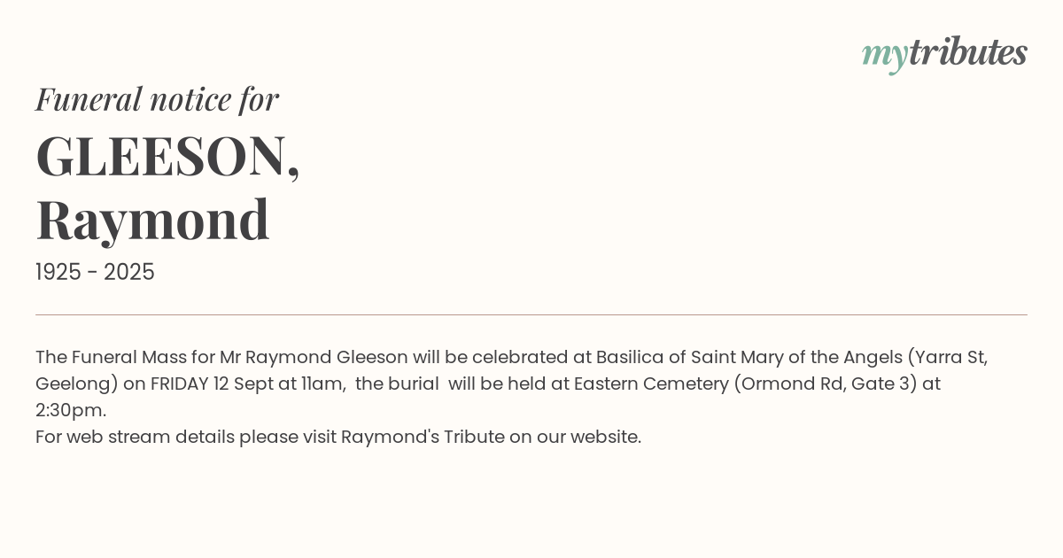 16°CThe Funeral Mass for Mr Raymond Gleeson will be celebrated at Basilica of Saint Mary of the Angels (Yarra St, Geelong) on FRIDAY 12 Sept at 11am, the burial will be held at Eastern Cemetery (Ormond Rd, Gate 3) at 2:30pm.