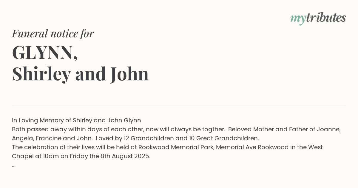 The celebration of their lives will be held at Rookwood Memorial Park, Memorial Ave Rookwood in the West Chapel at 10am on Friday the 8th August 2025.