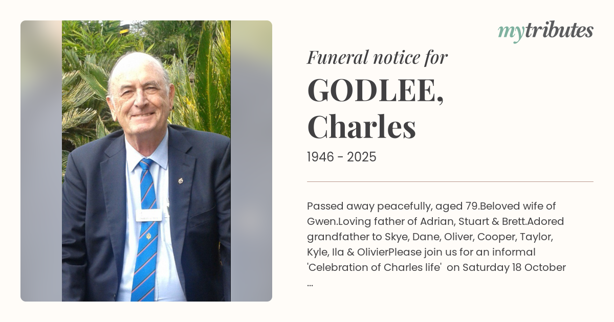 Please join us for an informal 'Celebration of Charles life' on Saturday 18 October at the Southport Yacht Club on the Gold Coast from 4pm.