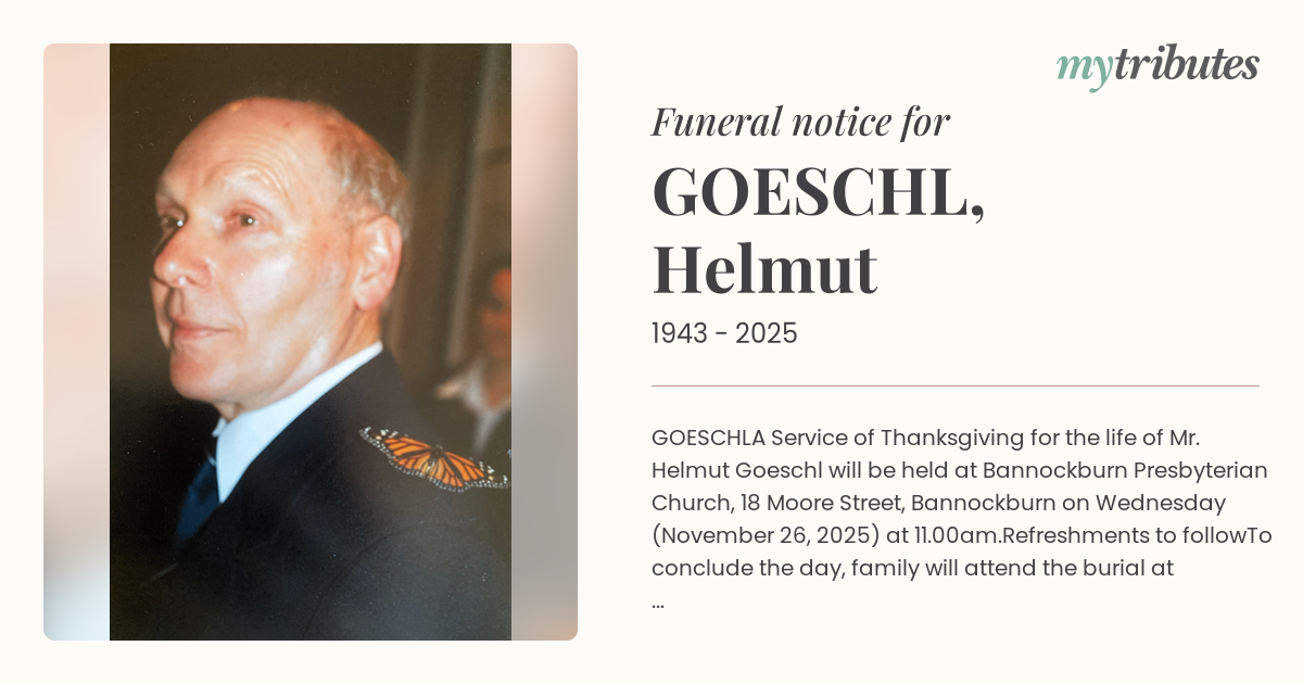 A Service of Thanksgiving for the life of Mr. Helmut Goeschl will be held at Bannockburn Presbyterian Church, 18 Moore Street, Bannockburn on Wednesday (November 26, 2025) at 11.00am.