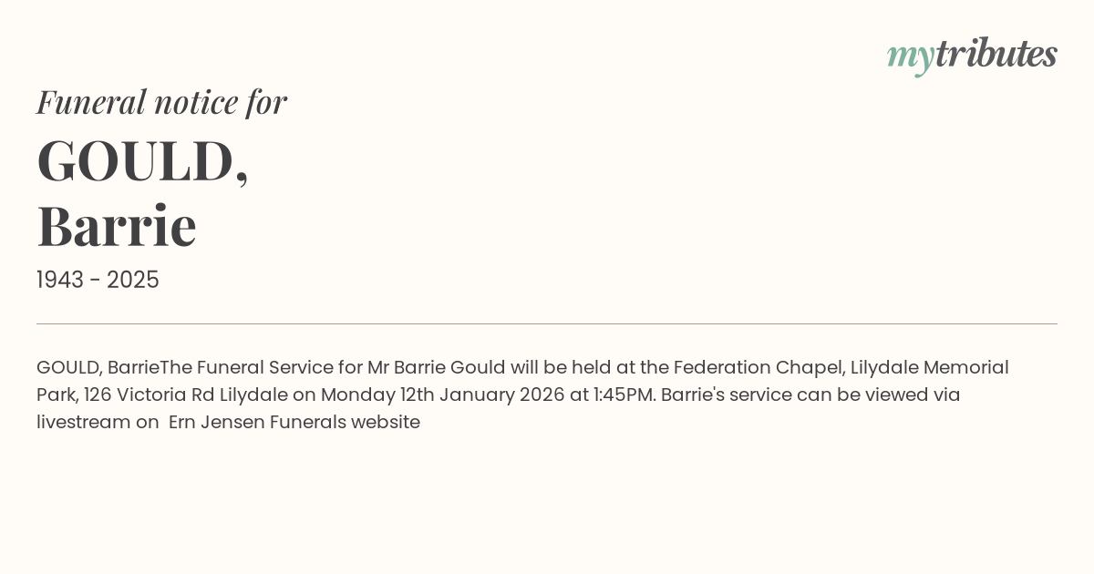 Mr Barrie Gould will be held at the Federation Chapel, Lilydale Memorial Park, 126 Victoria Rd Lilydale on Monday 12th January 2026 at 1:45PM.