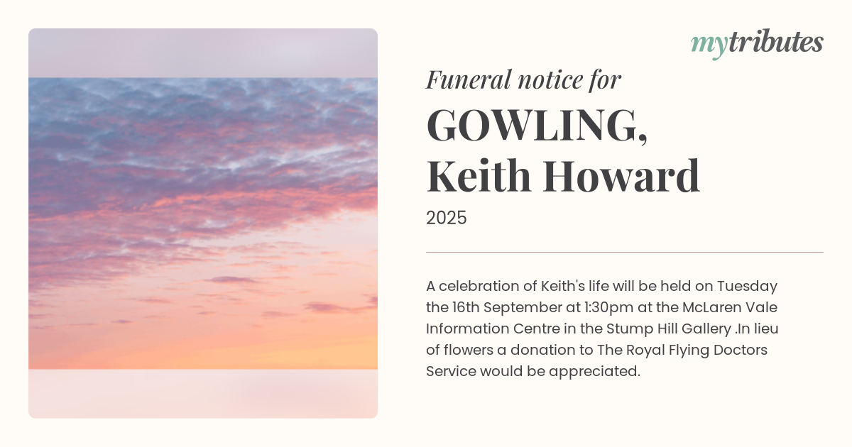 16°CA celebration of Keith's life will be held on Tuesday the 16th September at 1:30pm at the McLaren Vale Information Centre in the Stump Hill Gallery .