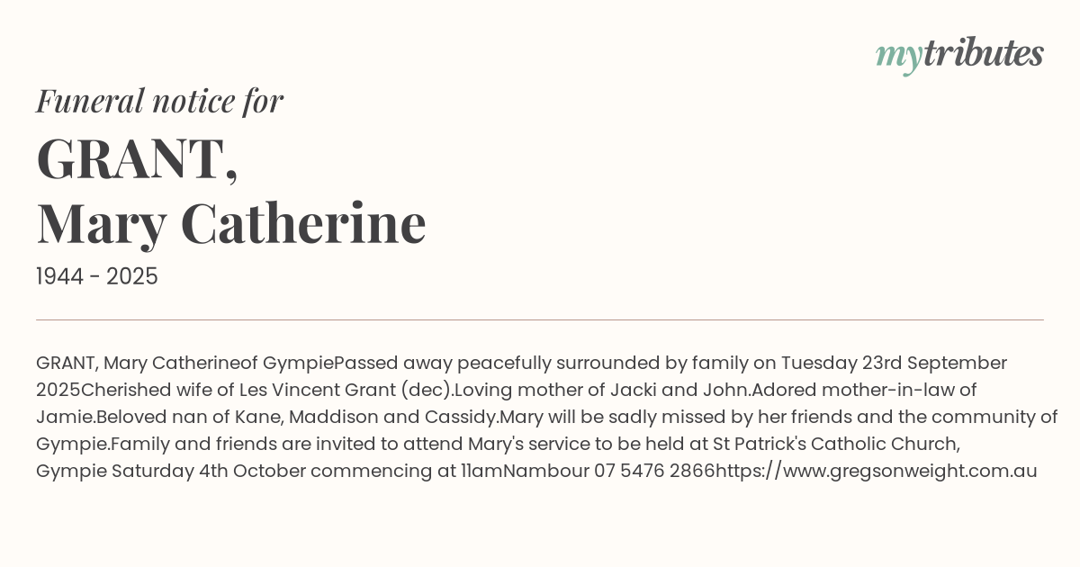 Family and friends are invited to attend Mary's service to be held at St Patrick's Catholic Church, Gympie