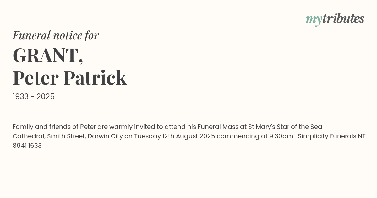16°CFamily and friends of Peter are warmly invited to attend his Funeral Mass at St Mary's Star of the Sea Cathedral, Smith Street, Darwin City on Tuesday 12th August 2025 commencing at 9:30am.