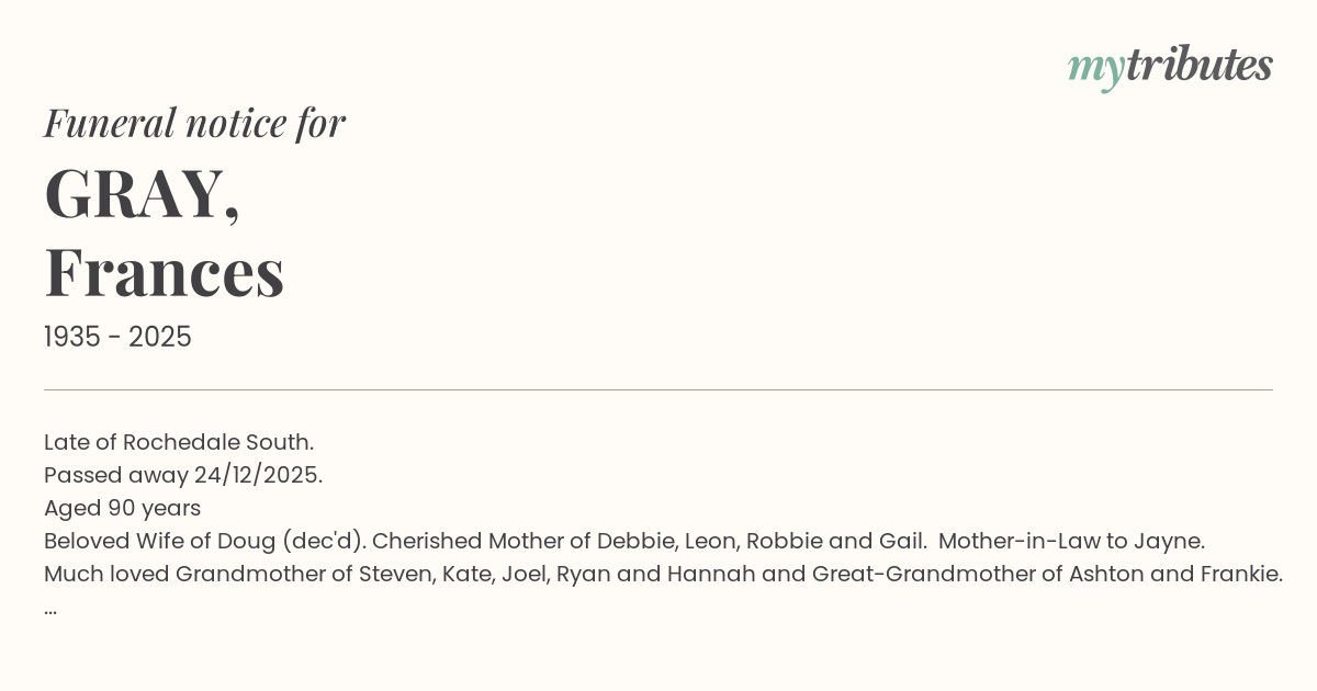 16°CLate of Rochedale South. Passed away 24/12/2025. Aged 90 years Beloved Wife of Doug (dec'd). Cherished Mother of Debbie, Leon, Robbie and Gail. Mother-in-Law to Jayne. Much loved Grandmother of Steven, Kate, Joel, Ryan and Hannah and Great-Grandmother of Ashton and Frankie. Family and friends are invited to attend a Funeral Service to celebrate Frances' Life, to be held at the George Hartnett Metropolitan Funerals Chapel, 224 Newnham Road, Mt.Gravatt on Wednesday, 07/01/2026 at 2:00pm.