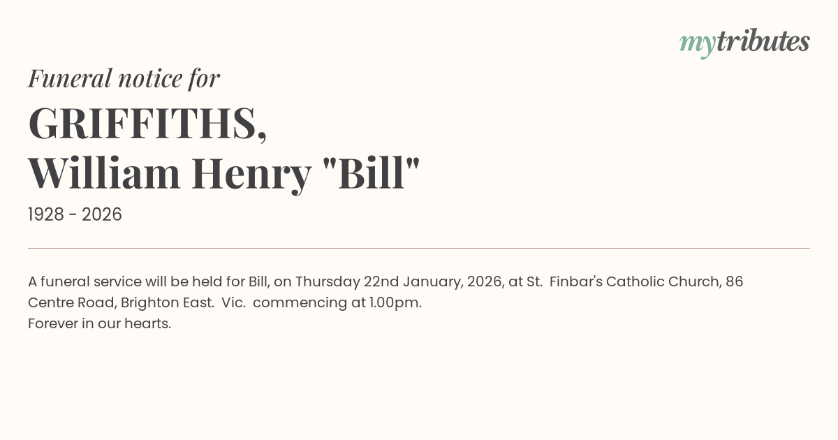 16°CA funeral service will be held for Bill, on Thursday 22nd January, 2026, at St. Finbar's Catholic Church, 86 Centre Road, Brighton East. Vic. commencing at 1.00pm.