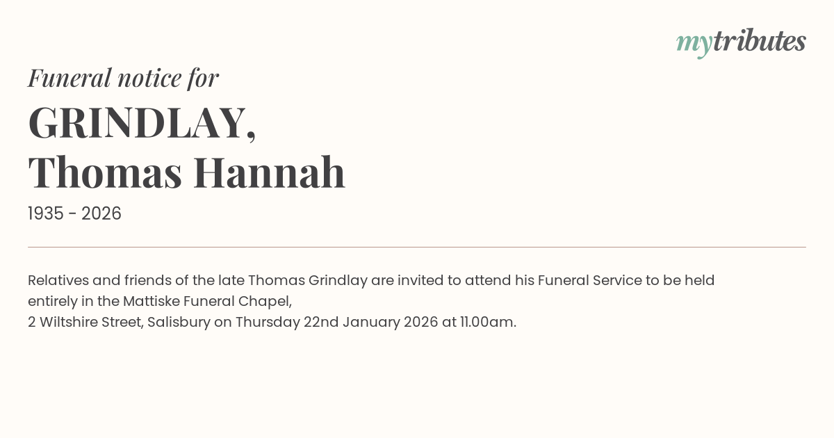 16°CRelatives and friends of the late Thomas Grindlay are invited to attend his Funeral Service to be held entirely in the Mattiske Funeral Chapel,