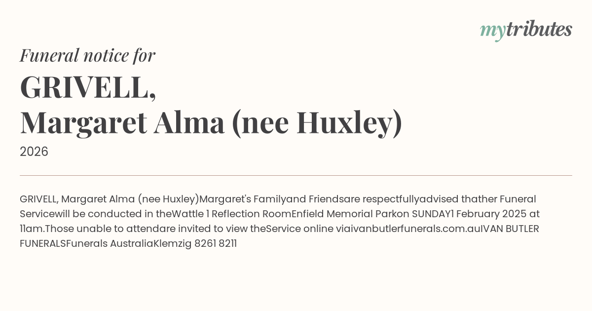 16°CGRIVELL, Margaret Alma (nee Huxley)