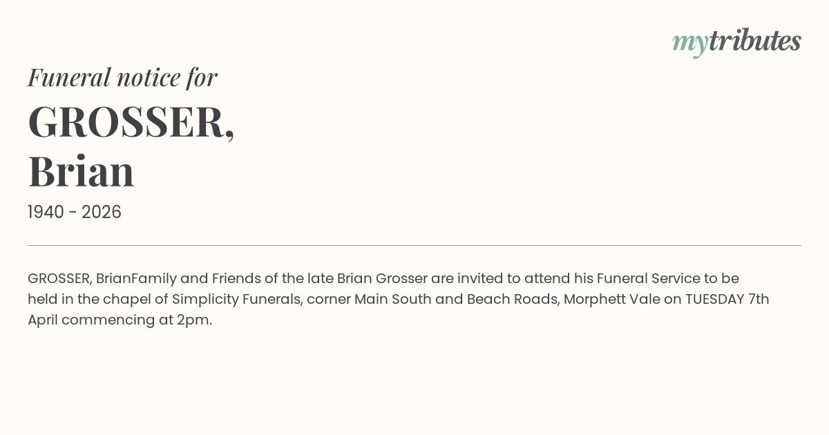 Family and Friends of the late Brian Grosser are invited to attend his Funeral Service to be held in the chapel of Simplicity Funerals, corner Main South and Beach Roads, Morphett Vale on TUESDAY 7th April commencing at 2pm.