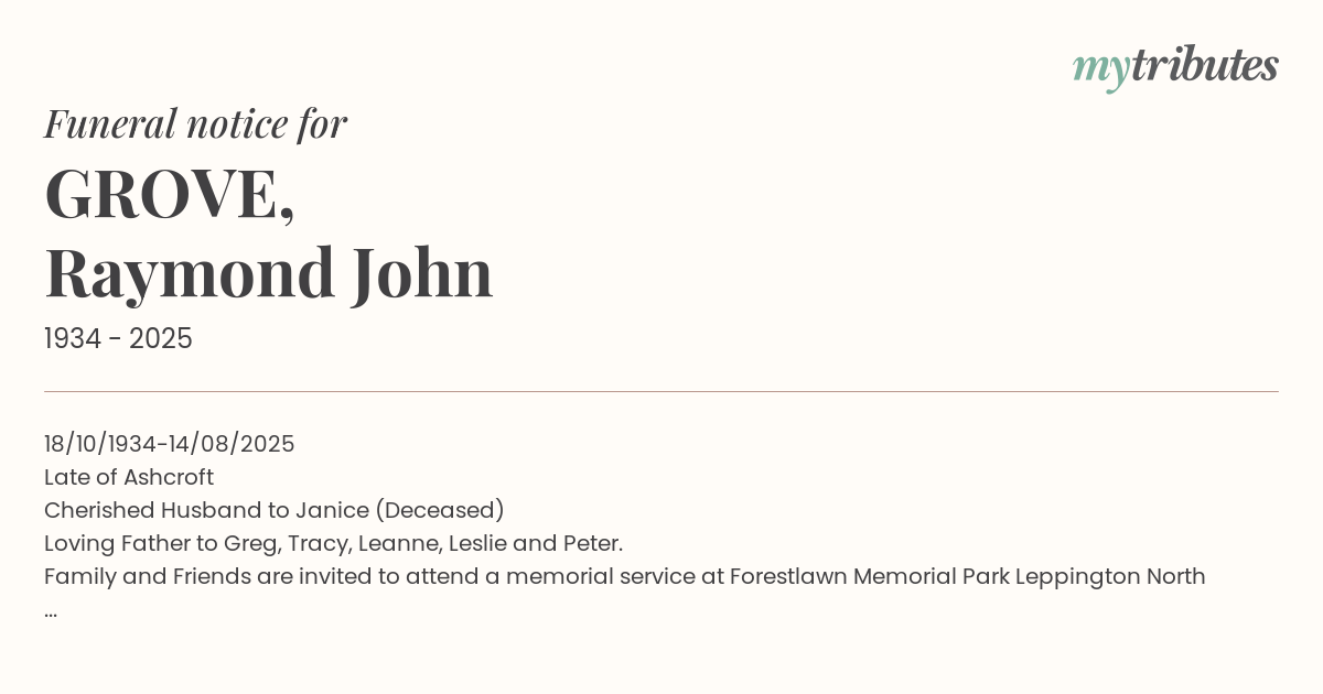 Family and Friends are invited to attend a memorial service at Forestlawn Memorial Park Leppington North Chapel on the 25/08/2025 at 10am.