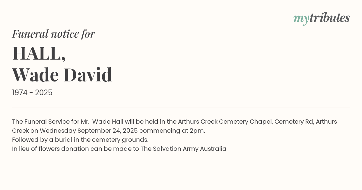 16°CThe Funeral Service for Mr. Wade Hall will be held in the Arthurs Creek Cemetery Chapel, Cemetery Rd, Arthurs Creek on Wednesday September 24, 2025 commencing at 2pm.