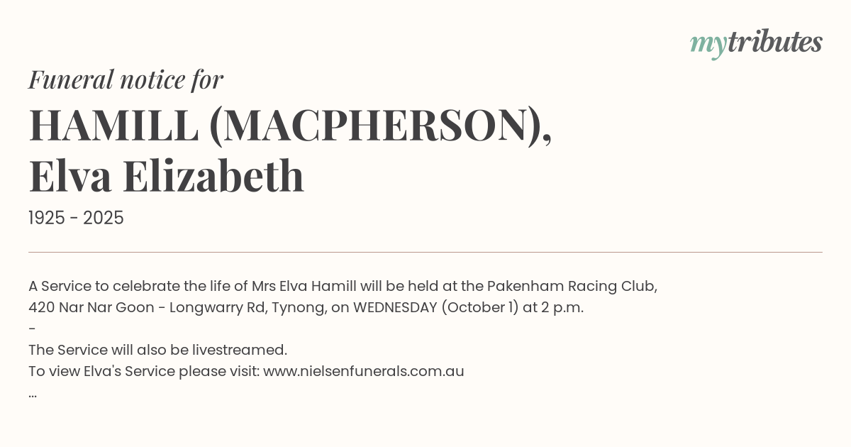 To view Elva's Service please visit: www.nielsenfunerals.com.au