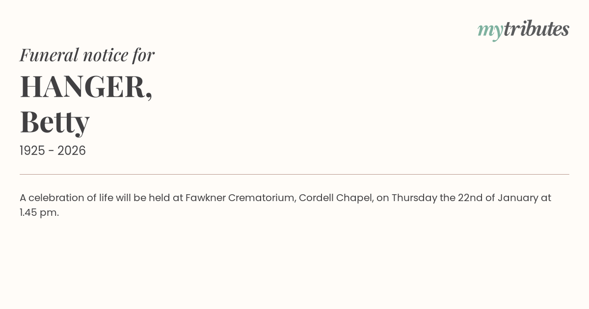 16°CA celebration of life will be held at Fawkner Crematorium, Cordell Chapel, on Thursday the 22nd of January at 1.45 pm.