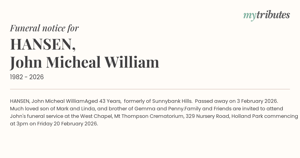 West Chapel, Mt Thompson Crematorium, 329 Nursery Road, Holland Park commencing at 3pm on Friday 20 February 2026.