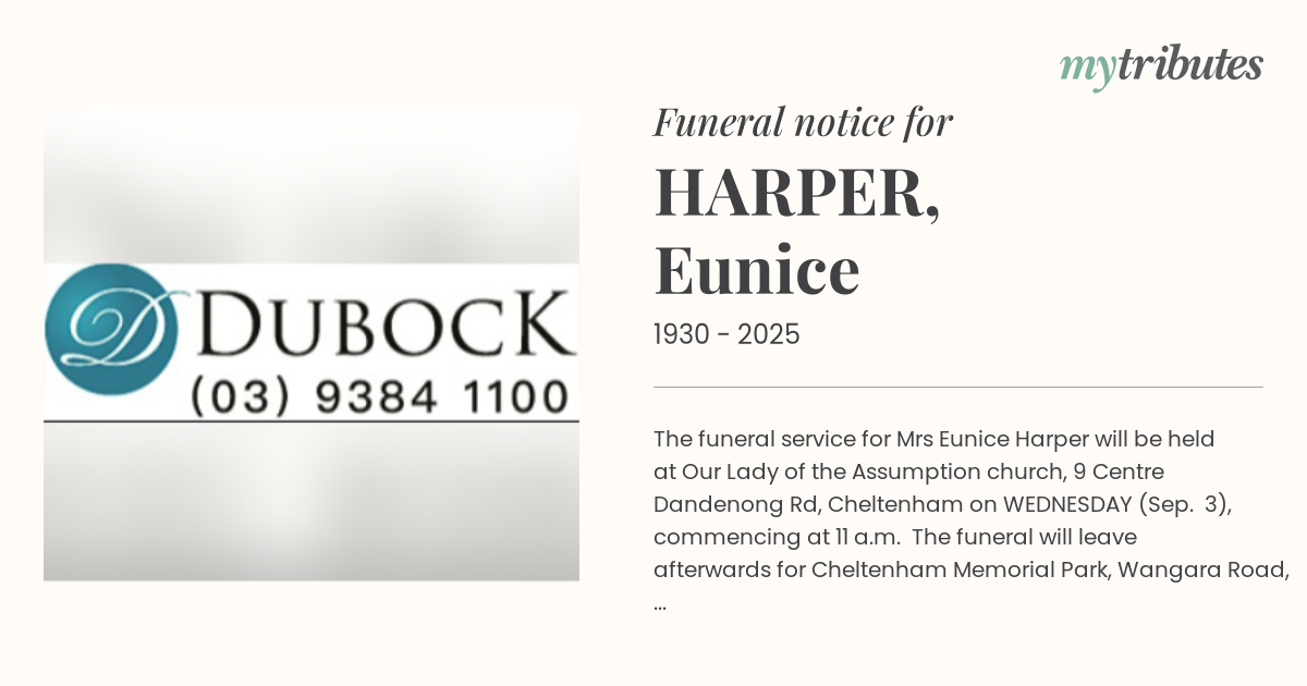 16°CThe funeral service for Mrs Eunice Harper will be held at Our Lady of the Assumption church, 9 Centre Dandenong Rd, Cheltenham on WEDNESDAY (Sep. 3), commencing at 11 a.m. The funeral will leave afterwards for Cheltenham Memorial Park, Wangara Road, Cheltenham