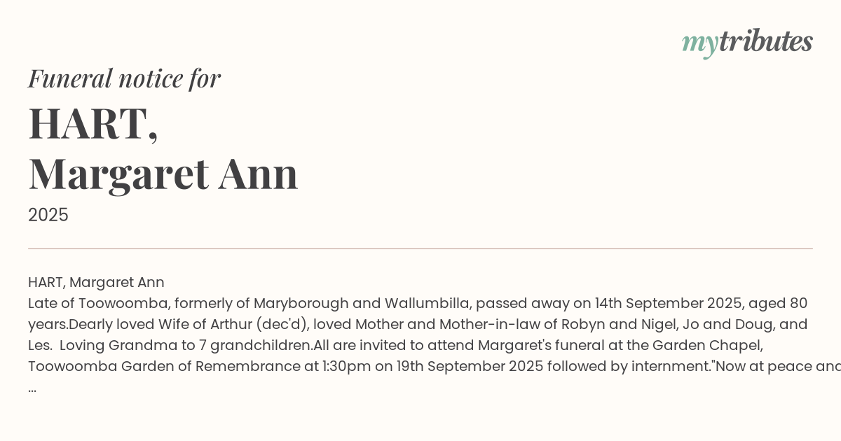 16°CHART, Margaret Ann Late of Toowoomba, formerly of Maryborough and Wallumbilla, passed away on 14th September 2025, aged 80 years.