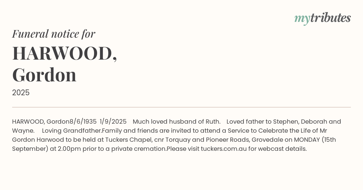 Mr Gordon Harwood to be held at Tuckers Chapel, cnr Torquay and Pioneer Roads, Grovedale on MONDAY (15th September) at 2.00pm prior to a private cremation.