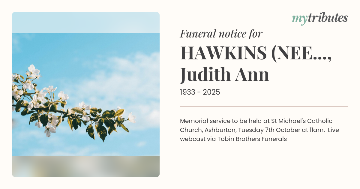 16°CMemorial service to be held at St Michael's Catholic Church, Ashburton, Tuesday 7th October at 11am. Live webcast via Tobin Brothers Funerals