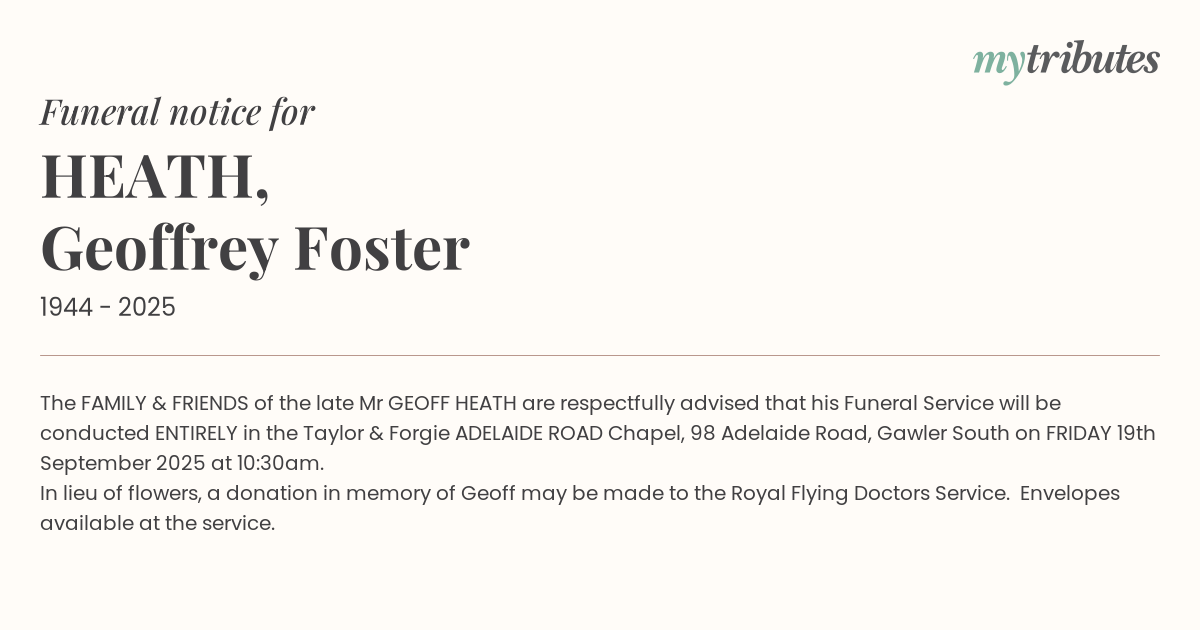 16°CThe FAMILY & FRIENDS of the late Mr GEOFF HEATH are respectfully advised that his Funeral Service will be conducted ENTIRELY in the Taylor & Forgie ADELAIDE ROAD Chapel, 98 Adelaide Road, Gawler South on FRIDAY 19th September 2025 at 10:30am.