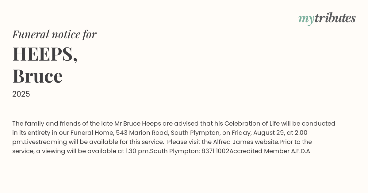 16°CThe family and friends of the late Mr Bruce Heeps are advised that his Celebration of Life will be conducted in its entirety in our Funeral Home, 543 Marion Road, South Plympton, on Friday, August 29, at 2.00 pm.