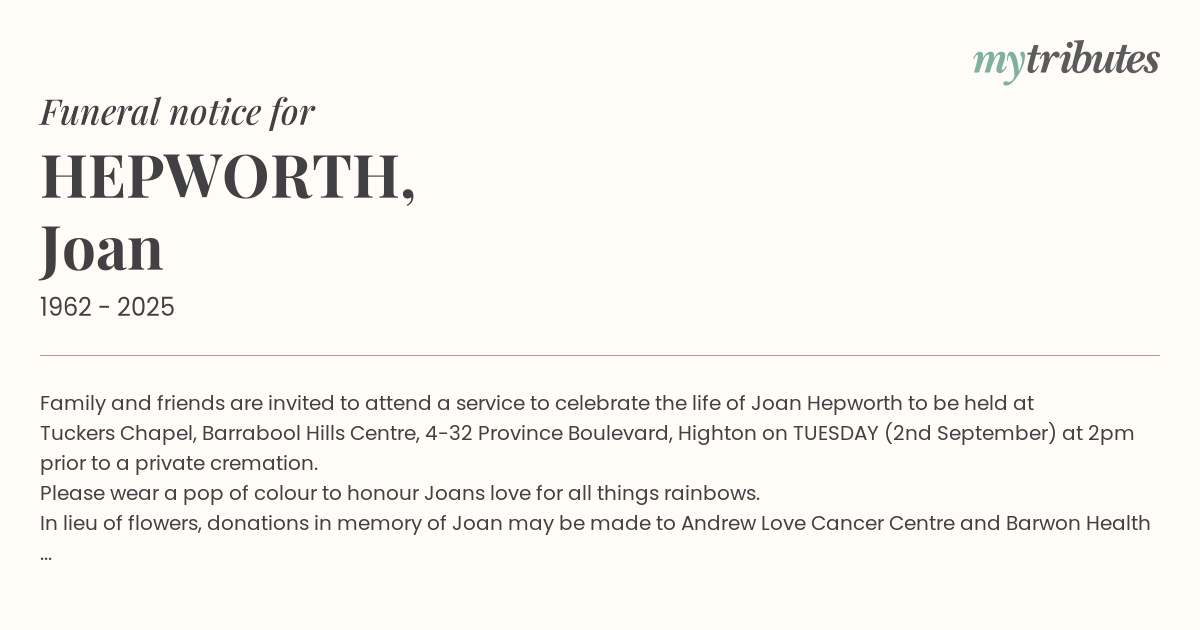 16°CFamily and friends are invited to attend a service to celebrate the life of Joan Hepworth to be held at Tuckers Chapel, Barrabool Hills Centre, 4-32 Province Boulevard, Highton on TUESDAY (2nd September) at 2pm prior to a private cremation.