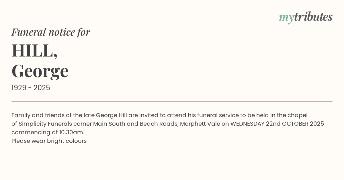 16°CFamily and friends of the late George Hill are invited to attend his funeral service to be held in the chapel of Simplicity Funerals corner Main South and Beach Roads, Morphett Vale on WEDNESDAY 22nd OCTOBER 2025 commencing at 10.30am.