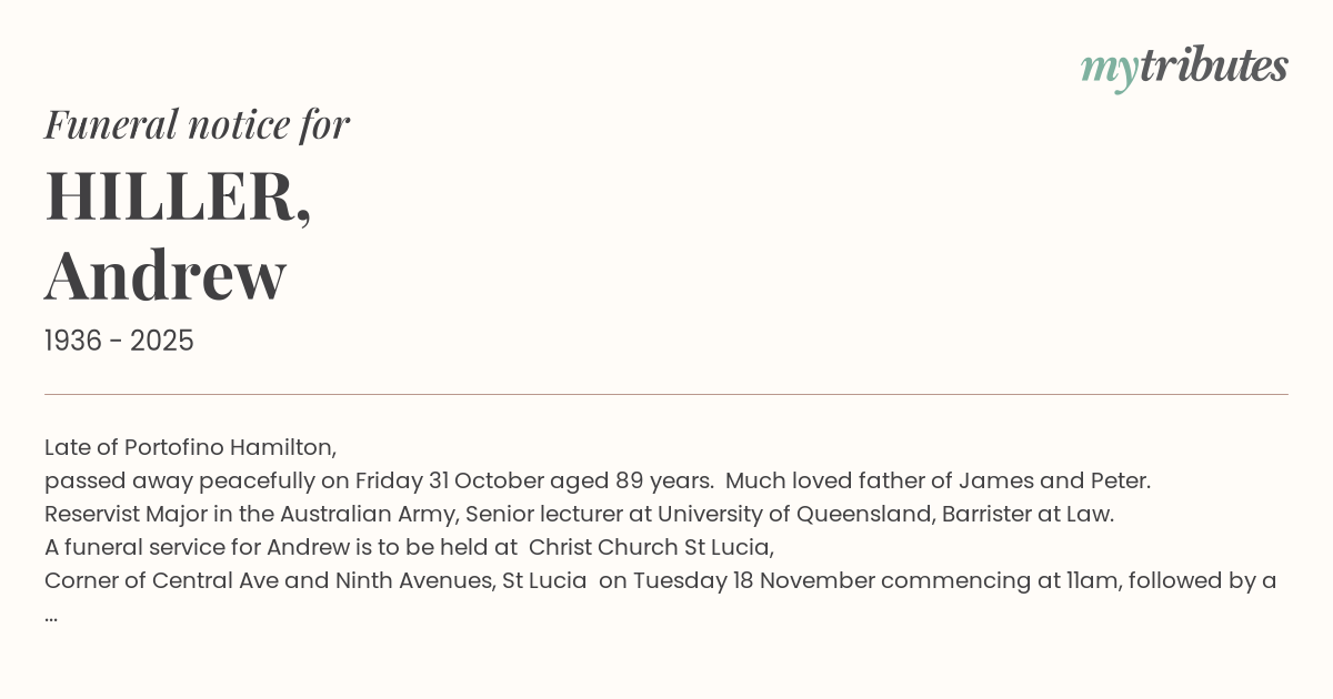 16°CLate of Portofino Hamilton, passed away peacefully on Friday 31 October aged 89 years. Much loved father of James and Peter. Reservist Major in the Australian Army, Senior lecturer at University of Queensland, Barrister at Law. A funeral service for Andrew is to be held at Christ Church St Lucia, Corner of Central Ave and Ninth Avenues, St Lucia on Tuesday 18 November commencing at 11am, followed by a private interment.