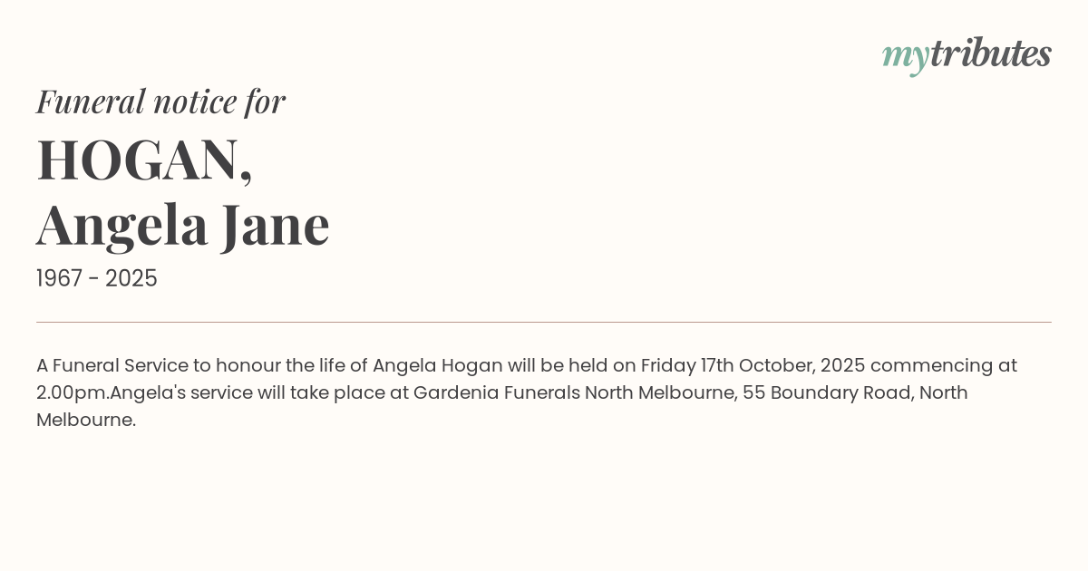 16°CA Funeral Service to honour the life of Angela Hogan will be held on Friday 17th October, 2025 commencing at 2.00pm.