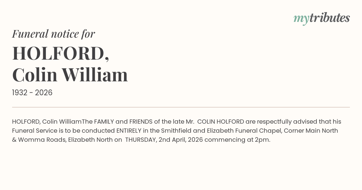 Mr. COLIN HOLFORD are respectfully advised that his Funeral Service is to be conducted ENTIRELY in the Smithfield and Elizabeth Funeral Chapel,