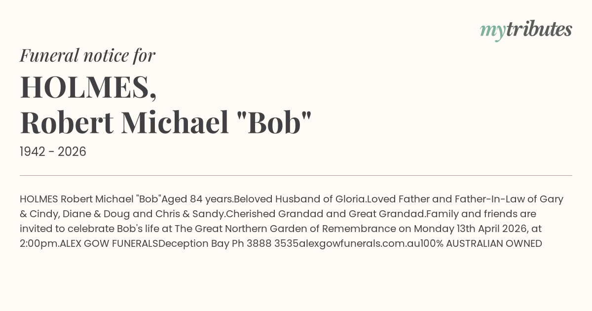 Family and friends are invited to celebrate Bob's life at The Great Northern Garden of Remembrance on Monday 13th April 2026, at 2:00pm.
