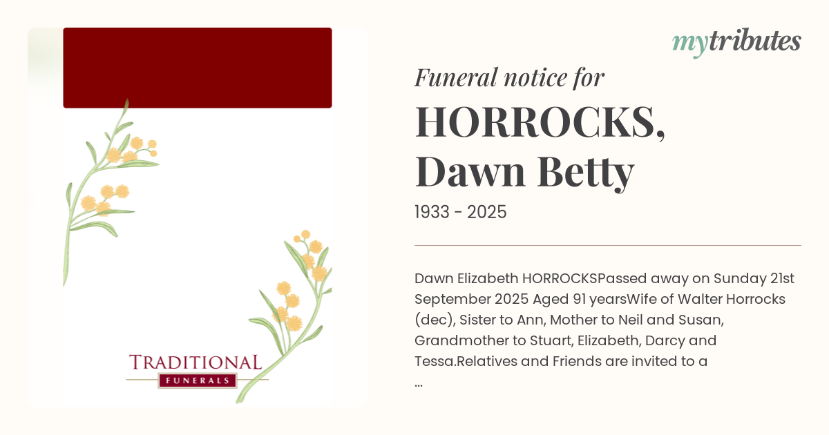 Wife of Walter Horrocks (dec), Sister to Ann, Mother to Neil and Susan, Grandmother to Stuart, Elizabeth, Darcy and Tessa.