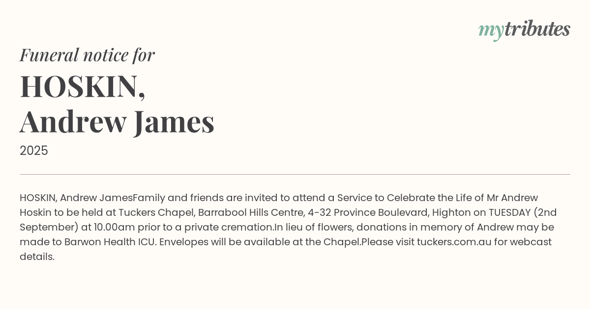 Family and friends are invited to attend a Service to Celebrate the Life of Mr Andrew Hoskin to be held at Tuckers Chapel, Barrabool Hills Centre, 4-32 Province Boulevard, Highton on TUESDAY (2nd September) at 10.00am prior to a private cremation.