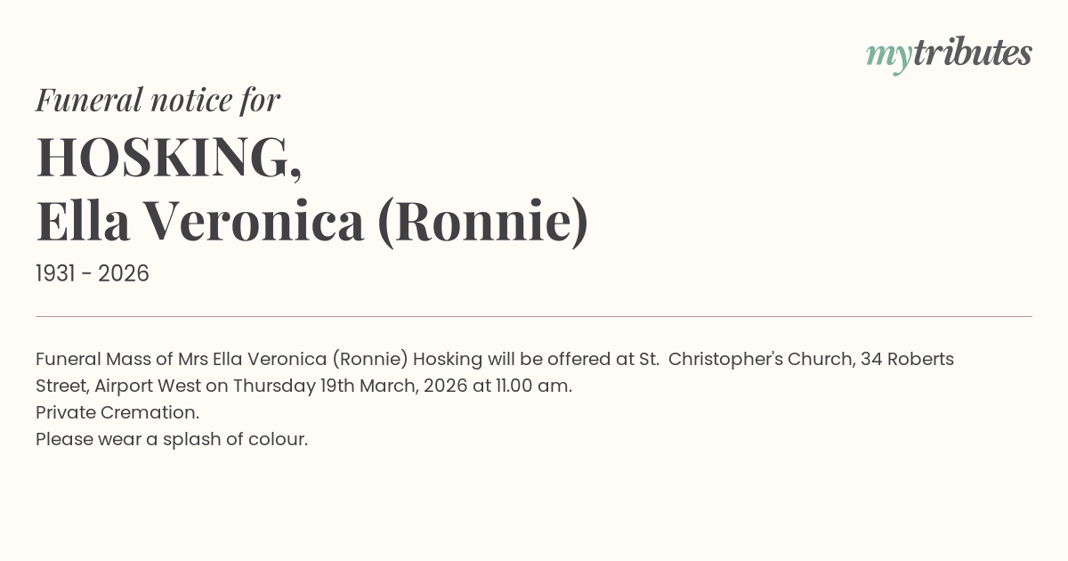 16°CFuneral Mass of Mrs Ella Veronica (Ronnie) Hosking will be offered at St. Christopher's Church, 34 Roberts Street, Airport West on Thursday 19th March, 2026 at 11.00 am.