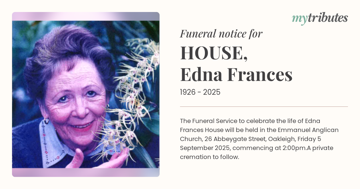 16°CThe Funeral Service to celebrate the life of Edna Frances House will be held in the Emmanuel Anglican Church, 26 Abbeygate Street, Oakleigh, Friday 5 September 2025, commencing at 2:00pm.