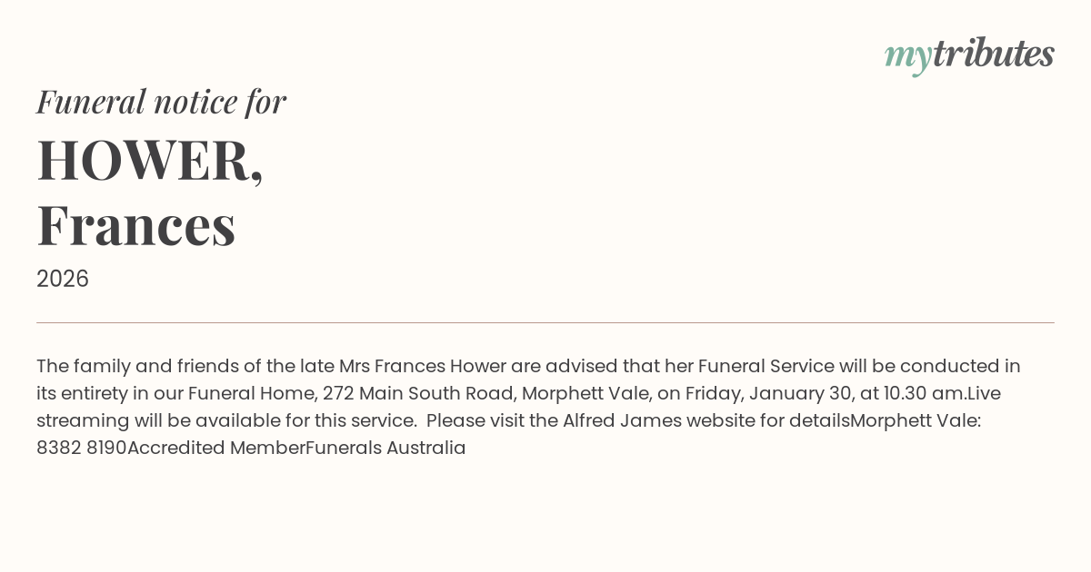 16°CThe family and friends of the late Mrs Frances Hower are advised that her Funeral Service will be conducted in its entirety in our Funeral Home, 272 Main South Road, Morphett Vale, on Friday, January 30, at 10.30 am.
