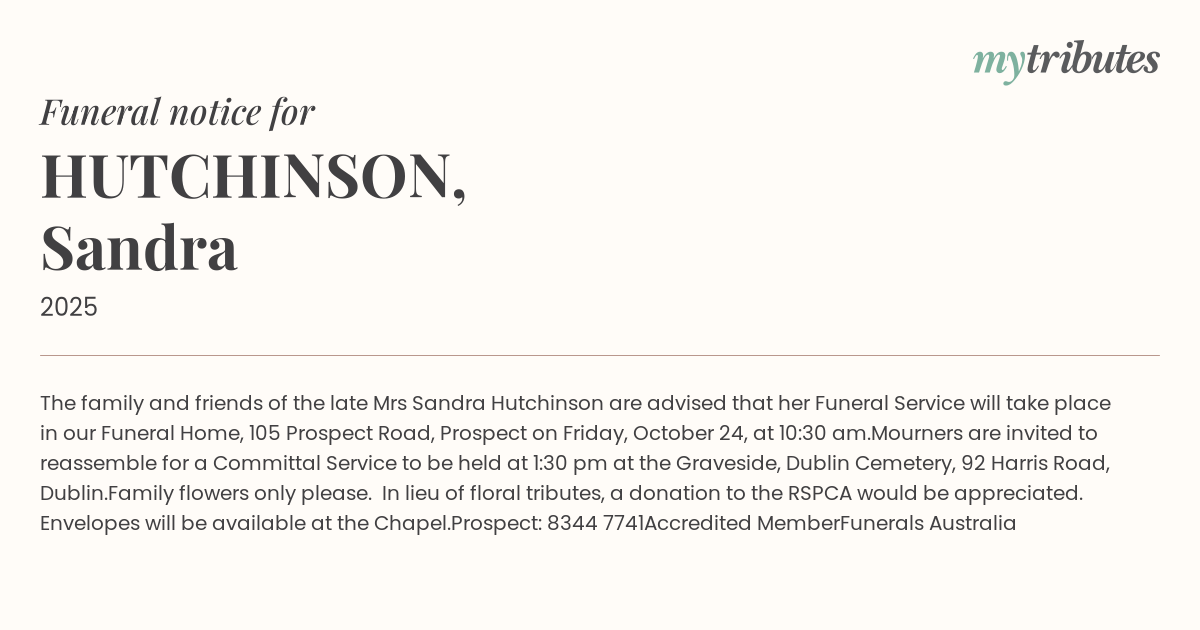 16°CThe family and friends of the late Mrs Sandra Hutchinson are advised that her Funeral Service will take place in our Funeral Home, 105 Prospect Road, Prospect on Friday, October 24, at 10:30 am.