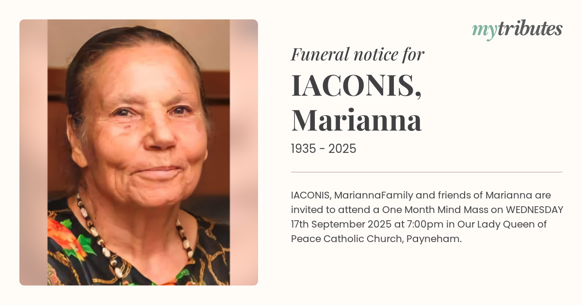 Family and friends of Marianna are invited to attend a One Month Mind Mass on WEDNESDAY 17th September 2025 at 7:00pm in Our Lady Queen of Peace Catholic Church, Payneham.