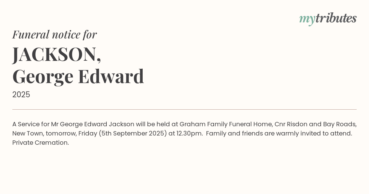 16°CA Service for Mr George Edward Jackson will be held at Graham Family Funeral Home, Cnr Risdon and Bay Roads, New Town, tomorrow, Friday (5th September 2025) at 12.30pm. Family and friends are warmly invited to attend. Private Cremation.